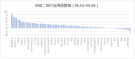 根据中信二级行业分类,涨幅靠前的行业有增值服务Ⅱ、元器件、通信设备制造、其他轻工Ⅱ、文娱轻工Ⅱ,分别上涨8.82%、7.36%、6.48%、6.39%、6.38%;跌幅靠前的行业有白色家电Ⅱ、商用车、工程机械Ⅱ、航空机场、装饰材料,分别下跌3.39%、1.44%、1.11%、0.97%、0.91%。
