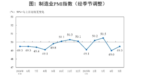 5月份,制造业采购经理指数(PMI)为49.5%,比上月上升0.5个百分点,制造业景气水平改善。
