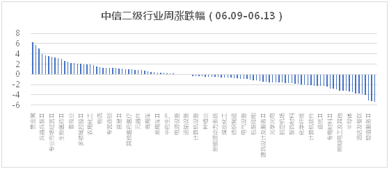 根据中信二级行业分类,涨幅靠前的行业有贵金属、油服工程、石油开采Ⅱ、兵器兵装Ⅱ、工业金属,分别上涨6.23%、5.68%、4.98%、3.95%、3.63%;跌幅靠前的行业有酒类、云服务、增值服务Ⅱ、房地产服务、新兴金融服务,分别下跌5.31%、5.25%、5.08%、4.00%、3.87%。