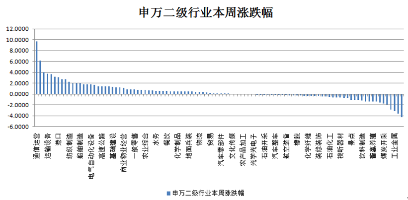 本周市场表现出的是盘整行情。申万二级行业领涨的有通信运营、玻璃制造、仪器仪表、运输设备行业,领跌的有黄金、稀有金属、工业金属、其他采掘等行业。