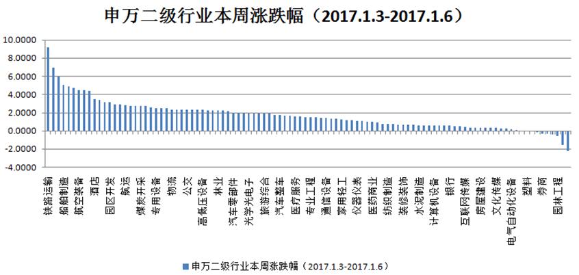 进入2017年,市场受节后信心恢复及国企改革等利好信息影响,走出了上涨行情。本周上证指数涨1.58%,深证指数涨0.82%,创业板指数持平,沪深300指数涨1.02%。本周涨幅前5名申万二级行业分别是铁路运输、地面兵装、石油化工、船舶制造、通信运营行业;跌幅前5名行业分别是电子制造、营销传播、园林工程、动物保健、中药行业。