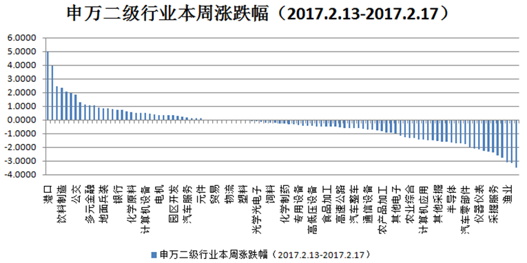 本周两市微幅上涨,上证指数涨0.17%,深证指数涨0.11%,中小板指涨0.36%,只有创业板指数跌1.15%,失守1900点。沪深300指数涨0.23%。本周涨幅前5名申万二级行业分别是港口、白色家电、林业、饮料制造、包装印刷行业;跌幅前5名行业分别是玻璃制造、通信运营、渔业、水泥制造、畜禽养殖行业。
