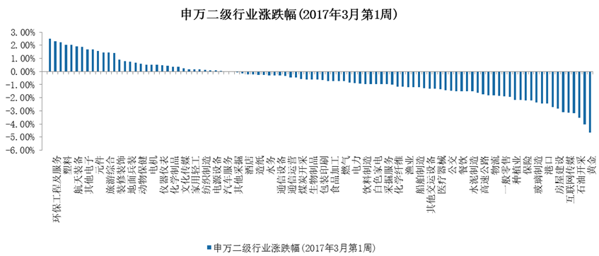 本周,上证指数下跌1.08%,深圳成指下跌0.45%,创业板指数下跌0.52%,中小板指数上涨0.66%。根据申万二级行业分类,本周涨幅靠前的板块是金属制品、环保工程及服务业、化学原料、塑料、稀有金属,涨幅分别为2.50%、2.31%、2.21%、2.01%、2.01%;跌幅靠前的板块是黄金、林业、石油开采、石油化工、互联网传媒,跌幅分别为-4.65%、-4.05%、-3.54%、-3.18%、-3.12%。