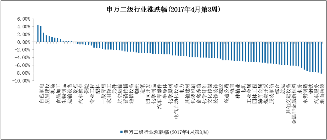 本周,上证指数下跌-2.25%,深圳成指下跌-1.53%,创业板指数下跌-1.96%,中小板指数下跌-0.68%。根据申万二级行业分类,本周涨幅靠前的板块是饮料制造、白色家电、中药、房屋建设、医药商业,涨幅分别为4.44%、4.15%、2.40%、1.69%、1.61%;跌幅靠前的板块是地面兵装、采掘服务、汽车服务、林业、钢铁,跌幅分别为-8.16%、-7.88%、-7.76%、-7.74%、-7.71%。