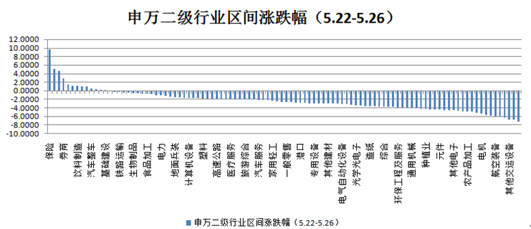 本周,上证指数涨0.63%,深圳成指跌1.12%,创业板指数跌2.3%。 根据申万二级行业分类,本周涨幅靠前的板块是保险、银行、航空运输、券商及房屋建设,上涨分别为9.66%、5.12%、4.64%,2.82%及1.46%;跌幅靠前的板块采掘服务、农业综合、其他交运设备、贸易及林业,下跌幅度分别为7.19%、6.69%、6.64%、6.26%及5.94%。