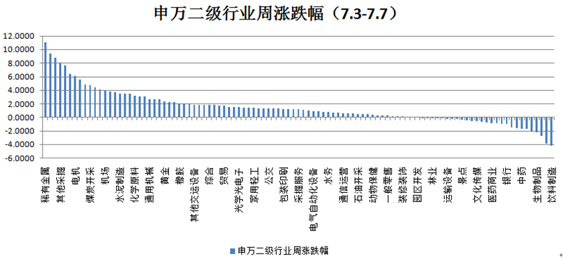 本周两市震荡上行,沪指站上3200点整数关口。行业方面,新能源汽车产业链、有色金属、煤炭钢铁等周期性股票领涨,风格方面,食品饮料、医药等白马股在本周开始回调,于此同时题材股表现活跃。
