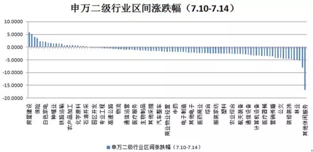 本周,上证指数涨0.14%,深圳成指跌1.29%,创业板指数跌4.9%。 根据申万二级行业分类,本周涨幅靠前的板块是房屋建设、银行、基础建设、保险及水泥制造,上涨分别为5.76%、5.15%、3.96%,3.51%及2.28%;跌幅靠前的其他休闲服务、环保工程及服务、畜禽养殖、林业及互联网传媒,下跌幅度分别为16.82%、7.95%、5.31%、5.0%及4.85%。