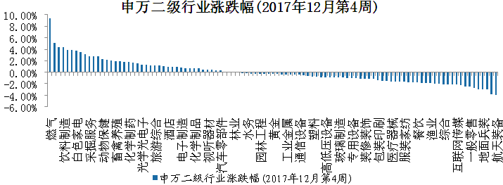 本周上证指数上涨0.95%, 深圳成指上涨0.87%,创业板指数下跌0.26%,中小板指数上涨0.37%。根据申万二级分类,本周涨幅靠前的板块是燃气、保险、医疗服务、饮料制造、煤炭开采,上涨幅分别为9.33%、5.19%、4.46%、4.43%及4.00%;本周跌幅靠前的板块为通信运营、地面兵装、半导体、商业物业经营、航天装备,下跌幅分别2.88%、2.90%、2.98%、3.83%及3.89%。