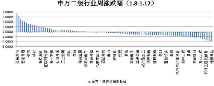 本周,上证指数涨1.1%,深圳成指涨1.05%,创业板指数跌0.87%。 根据申万二级行业分类,本周涨幅靠前的板块是白色家电、饮料制造、渔业、畜禽养殖、保险,上涨分别为6.79%、6.27%、4.98%,4.25%及4.16%;跌幅靠前的板块是地面兵装、半导体、运输设备、环保工程及服务、水泥制造,下跌幅度分别为3.62%、3.6%、3.52%、3.29%及3.07%。