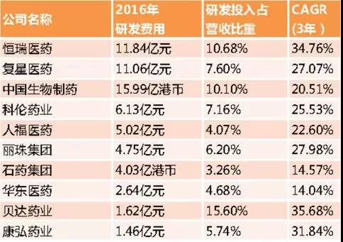研发能力是衡量一个医药企业未来发展的重要评价指标,研发支出占营业收入比例是常见的具体参数之一。数据显示,无论是政府层面的专项支持,还是企业历年的研发投入,都呈现出快速增长的趋势,这是未来行业增长的驱动力。根据2016年中国制药企业研发投入排名显示,贝达药业、恒瑞医药、中国生物制药的研发投入排名前列,研发营收比例分别为15.60%、10.68%和10.10%。