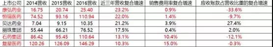 数据显示,营收体量超过百亿的公司有恒瑞医药、复星医药和石药集团。其中,恒瑞的销售费用对营收的拉动最明显,边际效益最高,同时,应收账款占营收的比重逐年降低,对下游的话语权逐渐增强。而复星对下游的话语权变化不大,但销售费用率增速不及营收复合增速,销售费用对收入的拉动力不足,投入产出比相对较低。