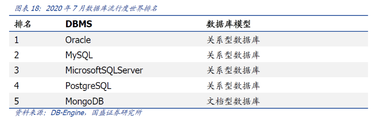 国外企业仍然占较高市场份额。Oracle占据中国数据库40%以上的市场份额(Oracle Database是甲骨文公司的一款关系数据库管理系统,在数据库领域一直处于领先地位的产品)。当前竞争格局是:Oracle、IBM等企业由于先发优势和极高的技术壁垒,长期占据国内主要市场份额。目前,主流数据库主要是以MySQL,Oracle,PG等为基础的。