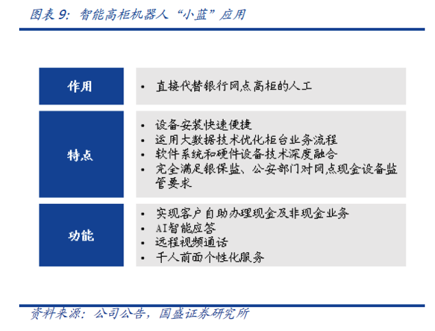 通过互联网+物联网(智慧网点),公司成功跨入了智慧银行领域,并实现了理念创新、技术创新、服务创新三大特点的独家优势。公司在创新未来银行的趋势下,自主研发的国内独家知识产权智慧银行设备“小蓝”,在完全保留传统高柜柜台的前提下,“小蓝”直接代替银行网点高柜的人工,客户在传统的高柜柜台前自助办理现金及非现金业务。目前,国内多家知名银行和省级农联社已启动智能机器人“小蓝”的网点试运营。为国内大中小银行快速实现网点转型,降低人工及运营成本,提高业务处理效率提供了坚实基础。