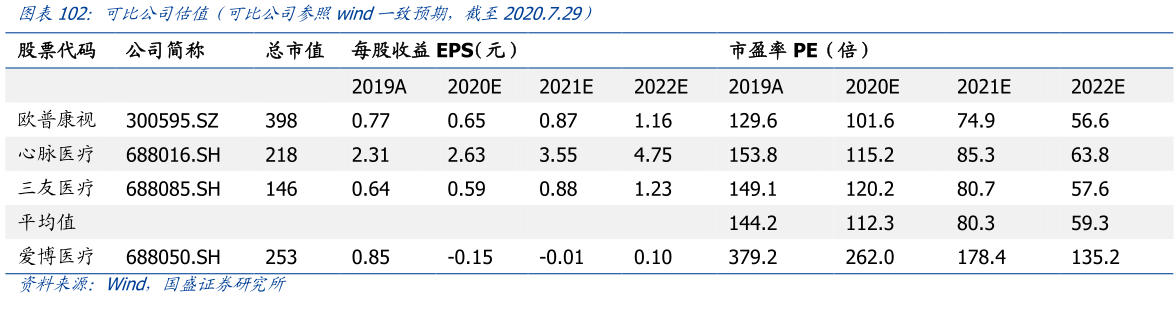 预计公司 2020-2022年归母净利润为 0.97、1.42、1.87 亿元,同比增长 44.7%、46.9%、31.9%,对应 PE 为 262x、178x、135x,爱博医疗作为国内眼科器械领域龙头企业,眼科赛道广阔,随着眼科手术类、视光类产品的进一步丰富和产品先发优势的不断体现,未来成长空间较大,相较可比公司给予一定估值溢价,爱博医疗作为国内眼科器械领域龙头企业,眼科赛道广阔,随着眼科手术类、视光类产品的进一步丰富和产品先发优势的不断体现,未来成长空间较大。