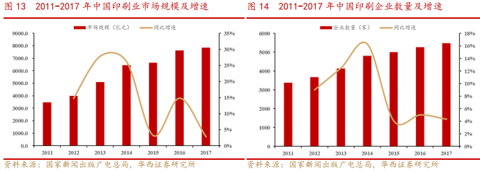 数据显示,2011-2017年,我国印刷业市场规模快速增长,多个年份增速在10%以上。2017年我国印刷业市场规模为7855.10亿元,同比增长2.82%。截至2017年底,我国印刷行业共有企业5491家,同比增长4.33%,市场竞争较为激烈,且缺乏规模较大的龙头企业,上市公司营收相对于巨大的市场总量而言体量尚小。而包装印刷业是近年来印刷子行业中最具成长性的行业之一,连续以10%~12%的增速快速增长。随着先进技术与设备的不断引进以及下游行业需求的不断增长,包装印刷业增速持续可观。