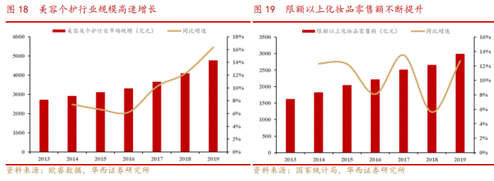 欧睿数据显示,中国美妆和个人护理市场规模从2013年的2492亿元上升至2019年的4777亿元,年化复合增速高达11.5%。同时,近年来限额以上化妆品零售额也不断提升。根据国家统计局的数据,限额以上化妆品零售额由2013年的1625亿元上升至2019年的 2992亿元,年化复合增速高达10.7%,在所有消费品类中位居第二。随着消费者消费水平的改善与消费习惯的改变,预计化妆品市场景气度将持续向好,未来三年美容个护行业规模增速有望保持在10%+。