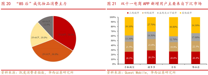 在化妆品消费中,“85 后”群体一直扮演者消费主力军的角色。根据凯度消费者指数的调查,“85”后消费群体对化妆品消费的贡献率总计已达到70%左右。由于三四线城市居住开支较低,物价相对便宜,三四线城市居民实际可支配收入相对更高,这也使得近些年来低线城市消费升级加速,下沉市场也因此成为化妆品市场的重要增量。根据Quest Mobile数据,2019年双十一各大电商平台的新增用户有60%以上来自下沉市场。因此,在未来化妆品市场的增长中,将着重深挖年轻消费群体与下沉市场消费群体的消费潜力。