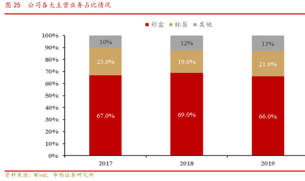 公司主要从事彩盒、标签等相关包装印刷产品的研发、生产和销售,主要为日化、食品生产企业提供全方位的包装印刷服务。公司主营业务分为彩盒业务、标签业务和说明书、宣传页、吊牌等其他主营业务三大类。其中,彩盒业务为公司营收占比最高的业务,近些年营收占比都达到60%以上。2019年,彩盒业务营收占比66%,标签业务营收占比21%,说明书、宣传页、吊牌等其他主营业务营收占比13%。