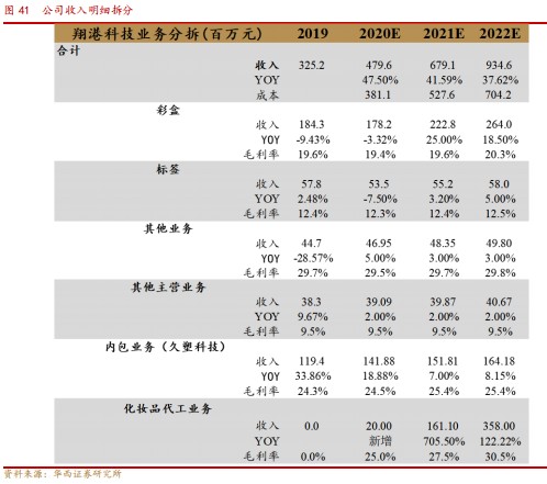 公司近年来在确保现有以日化产品为主的包材业务规模基础上,不断开发新包材市场,提升企业的盈利能力。公司于19年收购了知名化妆品包装供应商久塑科技70%股权,从而进一步丰富公司的包装产品品类,完善化妆品产业链布局。自2019年三季度开始,公司连续中标闻泰科技智能手机的包装订单,开始切入电子消费产品包装领域。此外,公司还通过子公司上海瑾亭化妆品有限公司新增了日化代工业务,试图利用优质化妆品客户资源,推进日化代工业务与公司的主业印刷包材业务的协同,达成一体化供应。