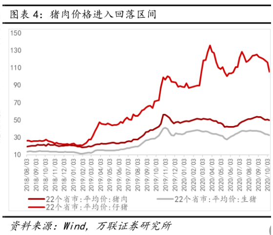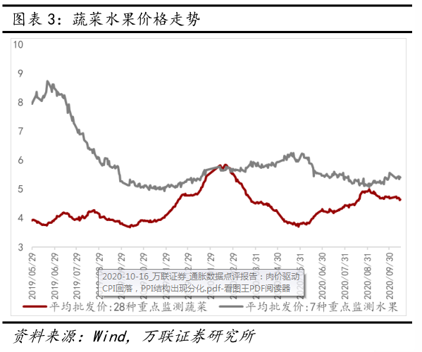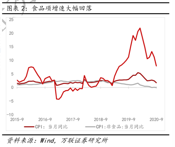 CPI同比继续回落,食品项为主要拖累项。细分来看,猪肉价格开始回落,且 2019 年同期猪肉价格进入快速攀升阶段,高基数导致同比增速大幅下滑,而猪肉的替代品牛羊肉的同比增速也随之下滑。随着猪肉供给的逐步修复,食品项增速预期仍将继续下滑。