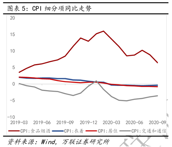 从 CPI 细分项来看,教育文化娱乐同比增速明显上行,学生返校、课外和民办教育收费上涨,电影行业也逐步复苏。交通、通信工具同比小幅修复,环比明显上行。衣着、居住、医疗保健等必须消费基本低位持平,非食品项环比来看整体小幅好转。