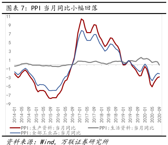 PPI同比结构分化,周期品价格走势出现分歧。黑色、有色金属价格延续上行,原油价格大幅下滑,导致石油开采、石油加工、化纤产业链整体价格回落。由于海外疫情反弹明显,对石油需求下降,导致价格波动。我国的房地产、基建对黑色、有色需求持续改善,黑色产业链依然景气度较强。煤炭开采业也环比明显上行,主要受环保采暖上游限产和拉尼娜气候带来的冷冬预期拉动。