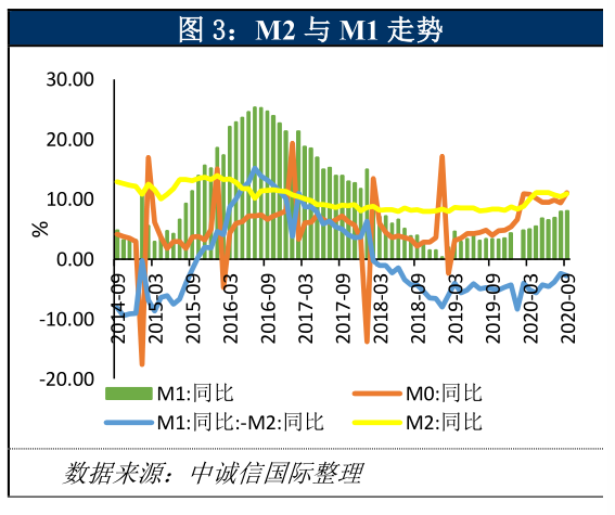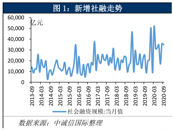 2020年9月新增社融3.48万亿(前值3.58万亿),新增人民币贷款1.9万亿元(前值1.28万亿),社融存量同比增长13.5%(前值13.3%),M2同比增长10.9%(前值10.4%),M1同比增长8.1%(前值8%)。