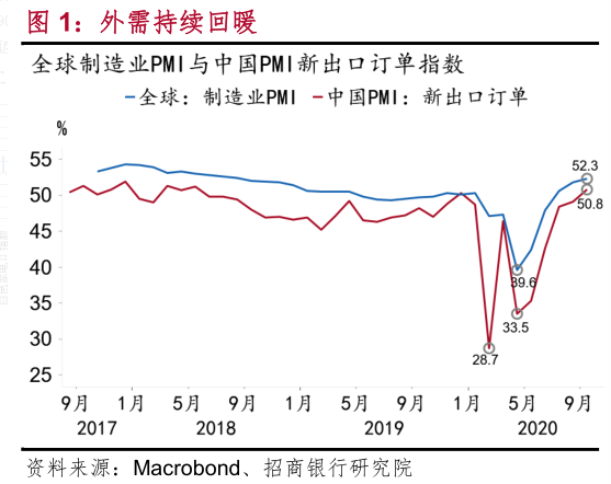 我国出口增速连续第四个月回升,再创年内新高。主要得益于两方面因素: 一是 全球经济重启带来的外需改善。9 月主要经济体制造业 PMI全线修复,我国 PMI 新出口订单指数为 50.8,去年 12 月以来首次回升至扩张区间;我国出口集装箱运价指数(CCFI)9 月同比增长 18.0%,为 2017 年 8 月以来最高水平,指向全球贸易逐步回暖。传统制造业产品出口延续 5 月以来的修复态势。 二是 由于海内外疫情 防控 形势差异,我国出口对其他国家形成 替代 。我国出口占美国市场的份额从 3 月的10.2%上升至 8 月的 20.1%。
