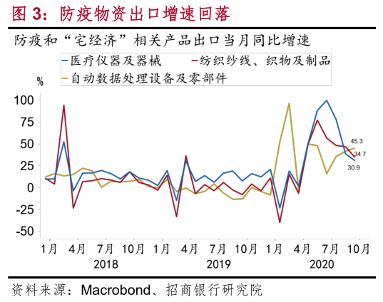 值得关注的是, 出口增速由于已至高位, 进一步上行动能边际减弱 。虽然海外疫情仍在延续,前期支撑我国出口的线上办公产品继续保持高景气,但防疫物资的增速已连续 4 个月回落。人民币升值压力和美国财政刺激政策的不确定性也限制了出口增速进一步上行的空间。