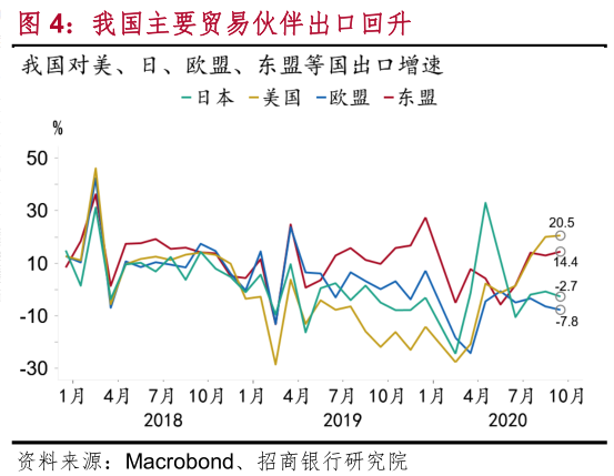 9 月在内外需持续改善的带动下,我国进出口双双超预期回升,均创年内新高。四季度在全球贸易回暖和境外疫情反弹的形势下,我国出口有望继续保持较高增速,但近期人民币大幅升值以及美国财政刺激政策的不确定性或将限制出口增速进一步上行空间。进口增速将继续得到内需修复和中美贸易协议的双重支撑。整体来看,全年出口增速有望由负转正,净出口将对我国经济增长形成拉动。