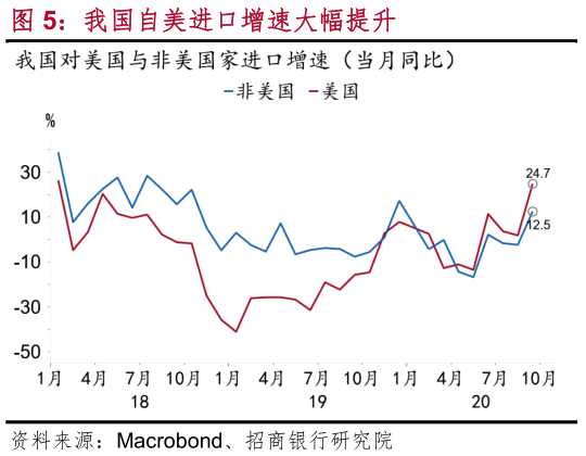 分地区看,除美国外,我国对主要贸易伙伴国家的进口均大幅提升。从欧盟、日本、韩国和东南亚的进口增速分别为 11.1%(+15.7pct)、13.4%(+14.3pct)、17.2%(+18pct)和 11.7%(+0.5pct)。