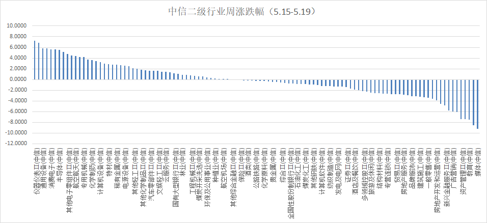 行业方面,根据中信二级行业分类,本周涨幅靠前的板块是仪器仪表、通信设备、通用设备、照明电工及消费电子板块,上涨幅度分别为7.21%、6.90%、5.80%、5.79%及5.64%;本周跌幅靠前的板块是互联网媒体、教育、汽车销售、资产管理及广告营销板块,下跌幅度分别为-9.19%、-7.52%、-7.41%、-7.37%%及-5.97%。