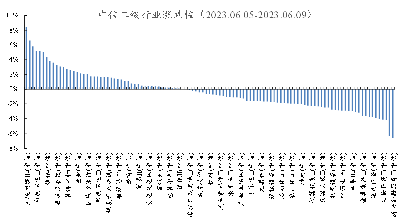 行业方面,根据中信二级行业分类,涨幅靠前的行业有互联网媒体、专业市场经营、电信运营、白色家电、增值服务,分别上涨8.43%、6.58%、5.82%、5.18%、5.17%;跌幅靠前的行业有新兴金融服务、新能源动力系统、其他军工、生物医药、化学纤维,分别下跌6.59%、6.36%、4.15%、4.14%、4.05%。