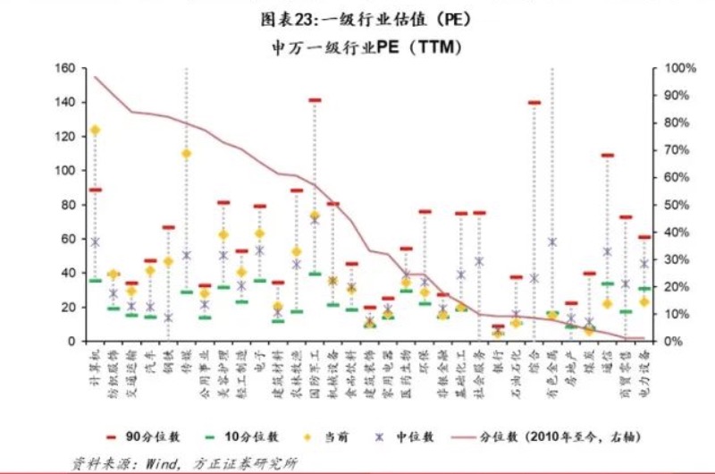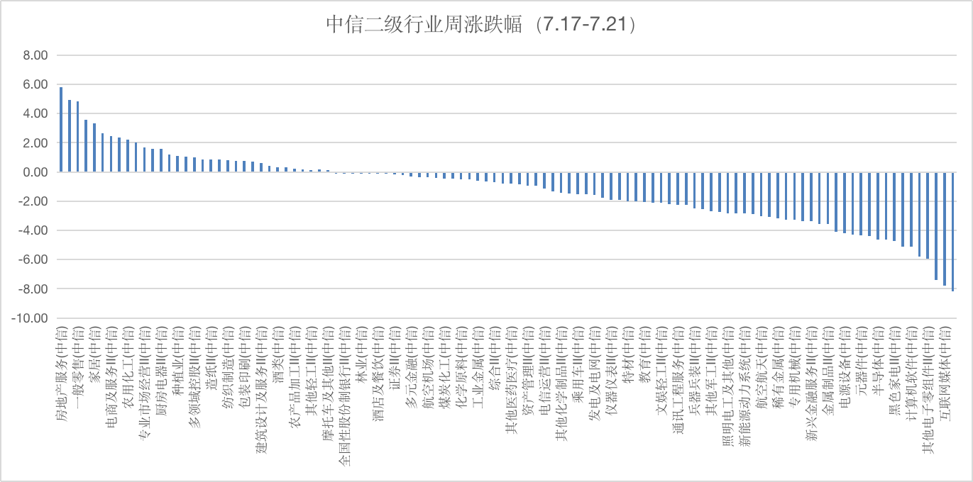 行业方面,根据中信二级行业分类,本周涨幅靠前的板块是房地产、装饰材料、零售、家居及畜牧业板块,上涨幅度分别为5.80%、4.92%、4.83%、3.34%及2.65%;本周跌幅靠前的板块是通信设备、互联网媒体、计算机设备、电子零件及文化娱乐板块,下跌幅度分别为-8.20%、-7.80%、-7.38%、-5.92%%及-5.79%。