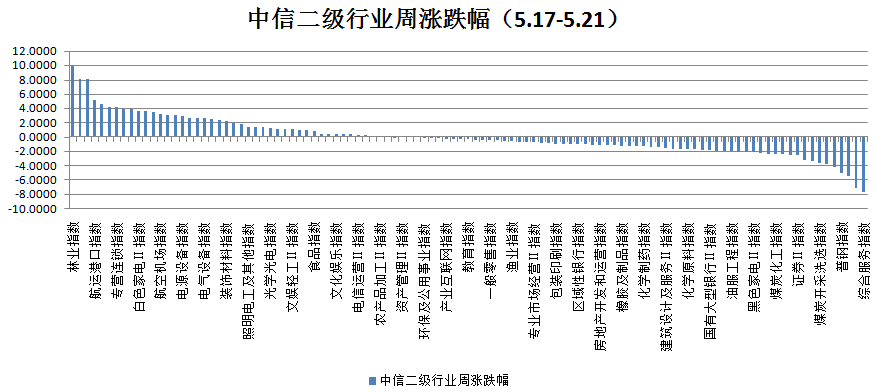 本周上证指数跌0.11%,创业板指数涨2.62%,沪深300指数涨0.46%,中证500指数涨0.03%。根据中信二级行业分类,本周涨幅靠前的行业是林业、厨房电器、乘用车、航运港口及稀有金属,上涨幅度分别为9.93%、8.14%、8.04%、5.16%、4.65%;本周跌幅靠前的行业是综合服务、化学纤维、生物医药、普钢及其他钢铁,下跌幅度分别为7.59%、7.02%、5.44%、5.04%、4.15%。