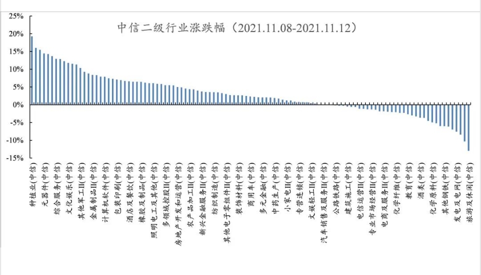 行业方面,根据中信二级行业分类,涨幅靠前的行业有种植业、兵器兵装、通讯工程、元器件、资产管理,分别上涨19.29%、16.01%、15.45%、14.45%、14.28%;跌幅靠前的行业有旅游休闲、石油开采、普钢、发电电网、煤炭开采,分别下跌12.98%、10.34%、8.42%、7.58%、6.99%。