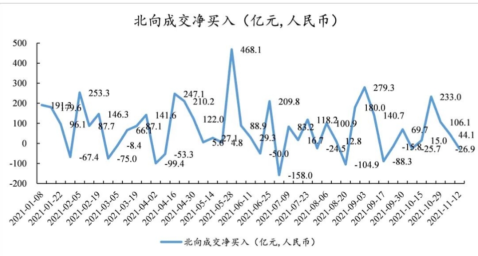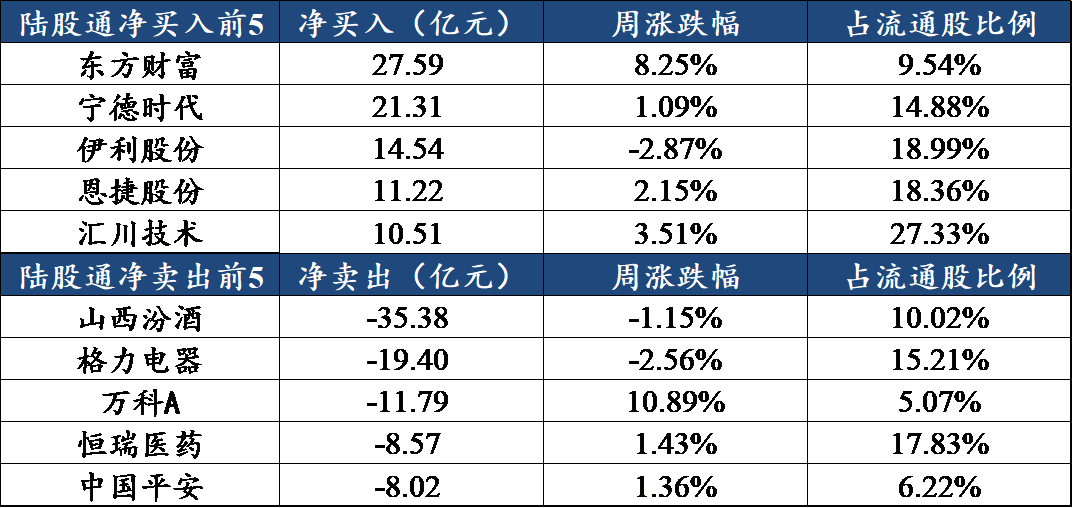 回顾一周沪深港通资金动向,本周北向资金合计净卖出26.9亿元人民币,北向资金本周主要流入电子、计算机、机械,流出食品饮料、医药、有色金属。
