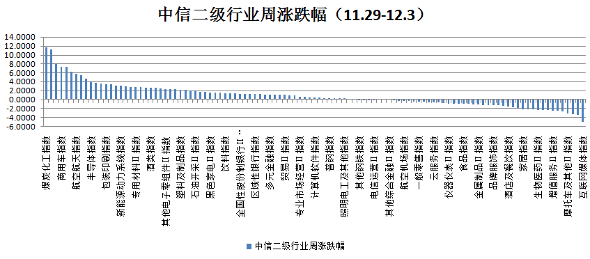 本周上证指数涨1.22%,创业板指数涨0.28%,沪深300指数涨0.84%,中证500指数涨1.14%。根据中信二级行业分类,本周涨幅靠前的行业是煤炭化工、航运港口、煤炭开采、商用车及林业,上涨幅度分别为11.72%、11.2%、7.97%、7.40%、7.30%;本周跌幅靠前的行业是互联网媒体、旅游及休闲、厨房电器、摩托车及文娱轻工,下跌幅度分别为4.92%、3.36%、3.16%、3.07%、2.54%。