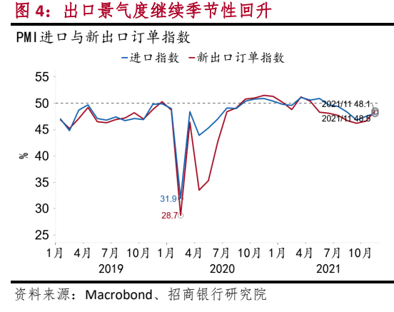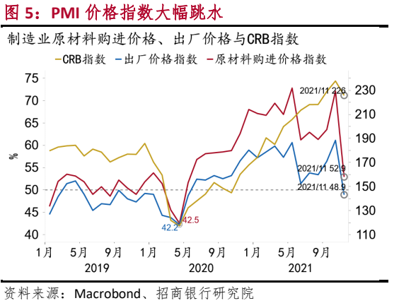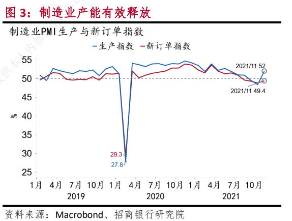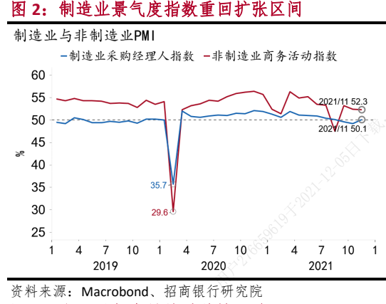 PMI数据11 月中国制造业采购经理人指数为 50.1%,较上月上升 0.9pct,重回扩张区间;非制造业商务活动指数为 52.3%,较上月略下降 0.1pct,继续高于临界点。点评:11 月制造业 PMI 重回扩张区间,供需回暖,库存上升、价格回落。双碳限电政策放松,产能逐渐恢复,但原材料价格长期高位仍拖累上游行业,消费类行业表现较好,受汽车和计算机行业拉动。非制造业恢复放缓,基建托底效果显现。受政策驱动,基建投资需求旺盛,房地产投资仍低迷;消费性服务业受新一波疫情冲击,生产性服务业受产能恢复拉动出现回升。