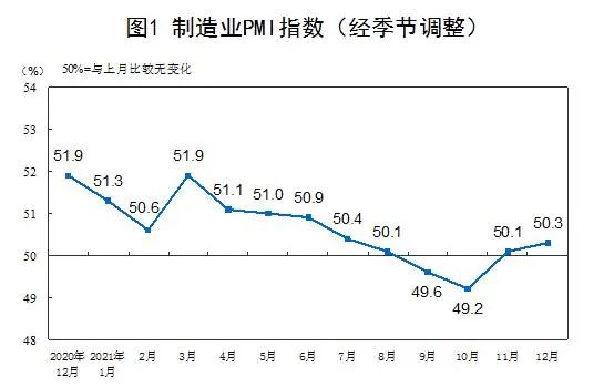 1、12月份,制造业采购经理指数50.3,比上月上升0.2 ,高于临界点,制造业景气水平继续回升。
