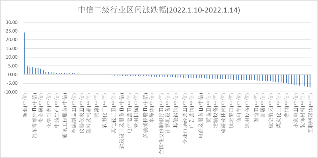 本周各主要指数涨跌不一,表现如下:创业板指数上涨0.73%,中证500指数下跌1.32%,上证指数下跌1.63%,沪深300下跌1.98%。行业方面,根据中信二级行业分类,涨幅靠前的行业有渔业、新能源动力系统、生物医药、汽车零部件和医药医疗分别上涨24.06%、4.70%、4.38%、4.13%、3.70%;跌幅靠前的行业有互联网媒体、结构材料、白色家电、装饰材料和厨房电器,分别下跌7.50%、7.17%、6.75%、6.72%、6.39%。