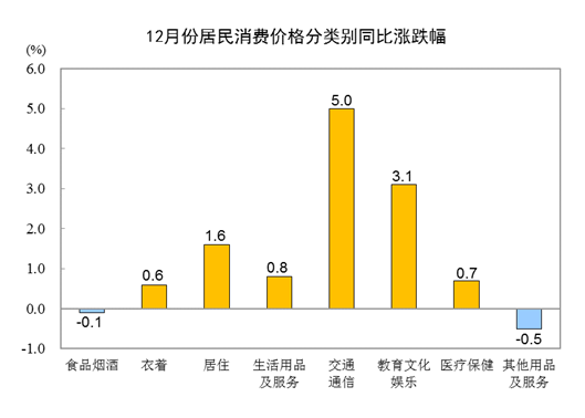 12月份,食品烟酒类价格同比下降0.1%,影响CPI下降约0.03个百分点。食品中,畜肉类价格下降22.2%,影响CPI下降约0.94个百分点,其中猪肉价格下降36.7%,影响CPI下降约0.81个百分点;蛋类价格上涨12.7%,影响CPI上涨约0.08个百分点;鲜菜价格上涨10.6%,影响CPI上涨约0.23个百分点;水产品价格上涨7.9%,影响CPI上涨约0.14个百分点;鲜果价格上涨4.8%,影响CPI上涨约0.09个百分点;粮食价格上涨2.0%,影响CPI上涨约0.04个百分点。 其他七大类价格同比六涨一降。其中,交通通信、教育文化娱乐、居住价格分别上涨5.0%、3.1%和1.6%,生活用品及服务、医疗保健、衣着价格分别上涨0.8%、0.7%和0.6%;其他用品及服务价格下降0.5%。