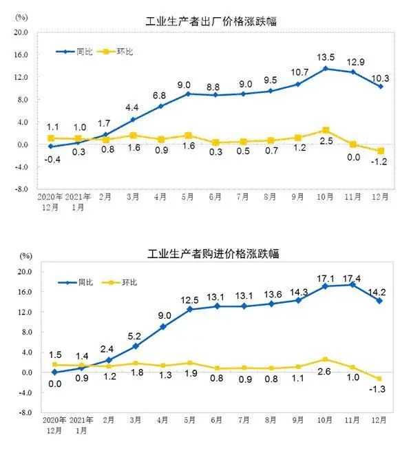 2、2021年12月份,全国工业生产者出厂价格同比上涨10.3%,环比下降1.2%;工业生产者购进价格同比上涨14.2%,环比下降1.3%。2021年全年,工业生产者出厂价格比上年上涨8.1%,工业生产者购进价格上涨11.0%。