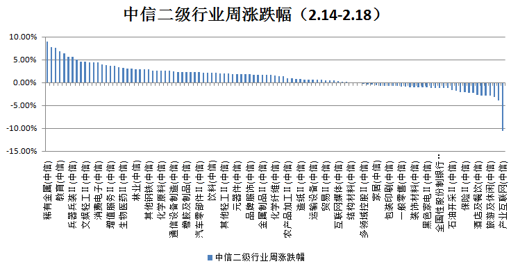 本周上证指数涨0.80%,创业板指数涨2.93%,沪深300指数涨1.08%,中证500指数涨1.33%。根据中信二级行业分类,本周涨幅靠前的行业是稀有金属、建筑装修、其他医药治疗、教育及农用化工,上涨幅度分别为8.87%、7.70%、7.51%、6.85%、6.41%;本周跌幅靠前的行业是产业互联网、新兴金融服务、证券、旅游休闲及房地产服务,下跌幅度分别为10.59%、3.93%、3.04%、2.81%、2.79%。