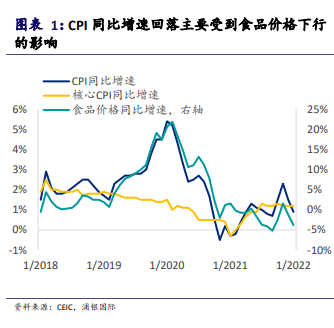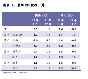 2022年1月,CPI 同比增速由前期的 1.5%回落至 0.9%,与市场预期(1.0%)基本持平;CPI 环比增速 由负转正,从前期的-0.3%升至 1 月的 0.4%。扣除食品和能源的 价格影响,2022 年 1 月的核心 CPI 同比增速维持 1.2%,环比增 速上升 0.1 个百分点至 0.1%,核心通胀较稳定。