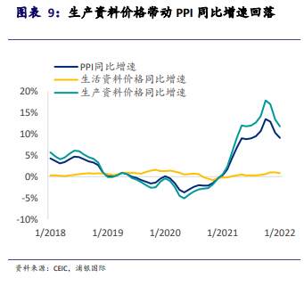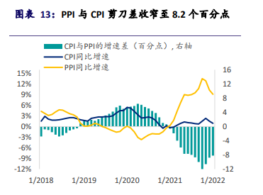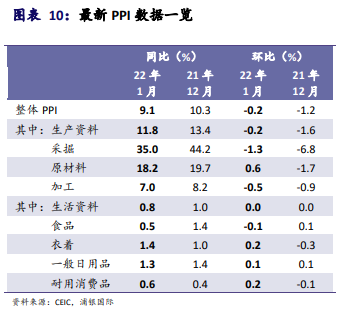 2022年1月,PPI 同比增速由前 期的 10.3%降至 9.1%,低于市场预期(9.5%);PPI 环比增速由 前期的-1.2%收窄至 1 月的-0.2%。其中,就同比增速而言,生产 资料价格从前期的 13.4%降至 1 月的 11.8%,生活资料价格从前 期的 1.0%降至 1 月的 0.8%。