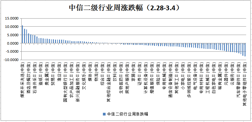 本周市场主要由外部情绪引领,俄乌战争持续发酵刺激原油等大宗商品进一步飙涨,也推动全球通胀的担忧,同时使得经济复苏的步伐变得艰难。市场也因此作出了积极反应,上游资源板块表现较好,中下游制造业受压比较明显。从另一个角度来看,地缘政治因素也会拖延全球经济的复苏,也会适度遏制美联储加息的力度。