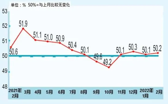 2月份,中国制造业采购经理指数(PMI)为50.2%,比上月上升0.1个百分点,继续高于临界点,制造业景气水平略有上升。