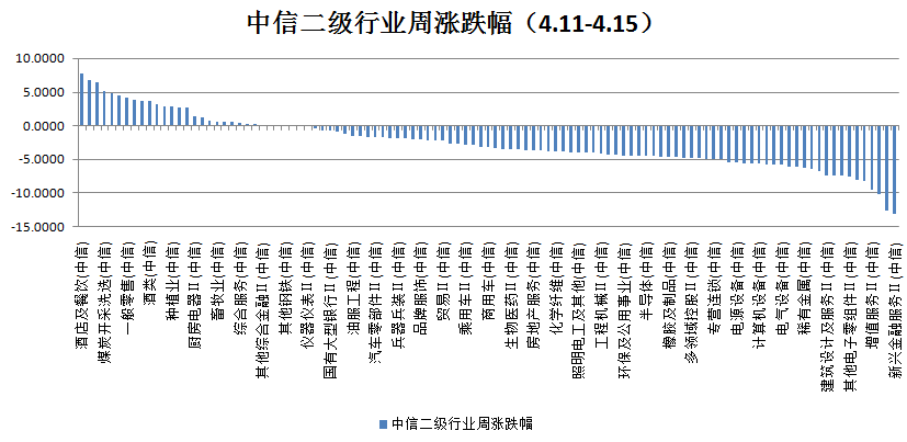 本周上证指数跌1.25%,创业板指数跌4.26%,沪深300指数跌0.99%,中证500指数跌2.46%。根据中信二级行业分类,本周涨幅靠前的行业是酒店餐饮、食品、旅游休闲、煤炭开采洗选及煤炭化工,上涨幅度分别为7.69%、6.68%、6.46%、5.10%、4.70%;本周跌幅靠前的行业是新兴金融服务、资产管理、建筑装修、增值服务及广告营销,下跌幅度分别为13.14%、12.71%、10.25%、9.59%、8.29%。