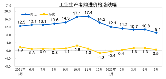 5月份,全国工业生产者出厂价格同比上涨6.4%,环比上涨0.1%;工业生产者购进价格同比上涨9.1%,环比上涨0.5%。1—5月平均,工业生产者出厂价格比去年同期上涨8.1%,工业生产者购进价格上涨10.8%。
